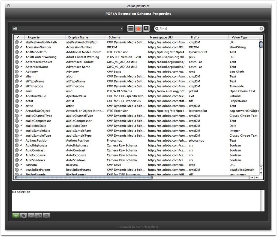 callas pdfaPilot comes with its own XMP Extension schema editor, which can be accessed via the action "Extension schema editor" in the "Metadata" section in the Switchboard. Here you can have a look at predefined schemas, data fields and value types or create your own to be embedded during conversion to PDF/A. You can also capture properties which are present in the document metadata.