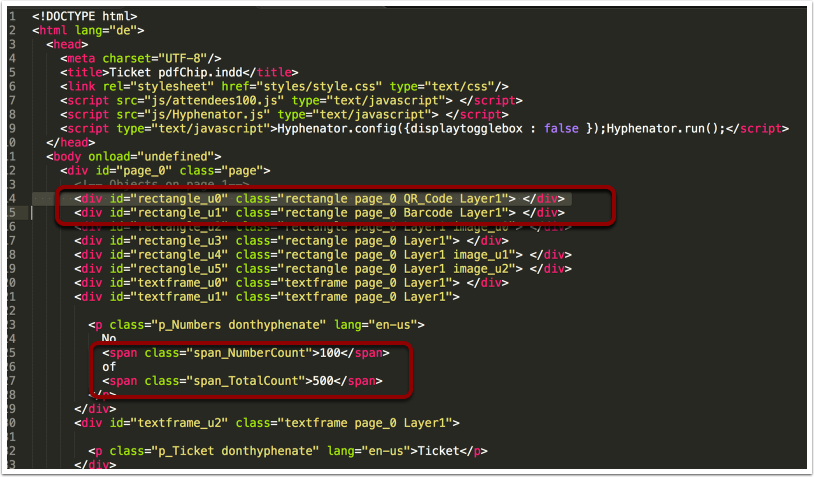 Each of the calls beginning with "document.getElementsByClassName" identifies one of the objects using either the Script Labels that we have used "attendeename", "Barcode" and "QR_Code" or by using their Character Style names "span_NumberCount" and "span_TotalCount" (or rather what the export script has made of them by prefixing them with span_).