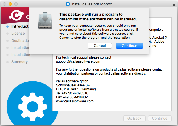callas software is a registered developer at Apple for MacOS. Due to some quite strict security settings starting with MacOS 10.7 only software downloaded from the Mac App Store can be installed directly. Just change the system settings in 'Security and Privacy' to 'Mac App Store and identified developers' before installing a callas software product. You can set it back to 'Mac App Store' after the installation ofcourse.