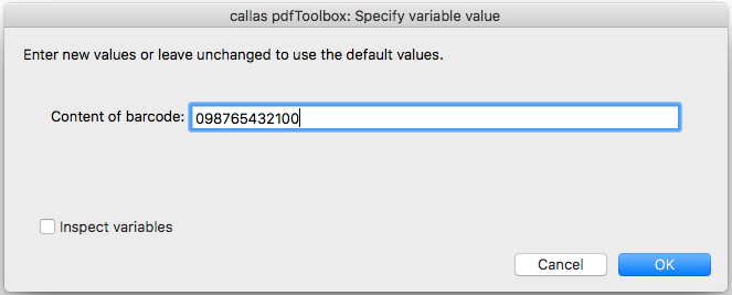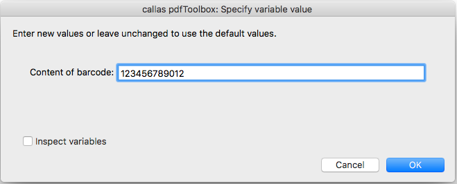Important: The value entered must consist of 12 or 13 digits. If 12 digits are entered, pdfToolbox will automatically calculate the required check digit. If 13 digits are entered, the 13th must be a valid check digit, otherwise the attempt to place the barcode will return an error.