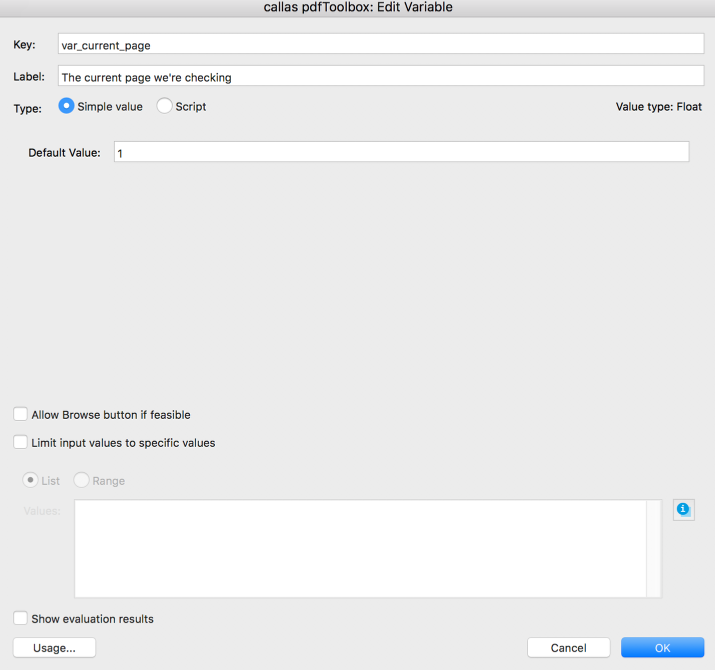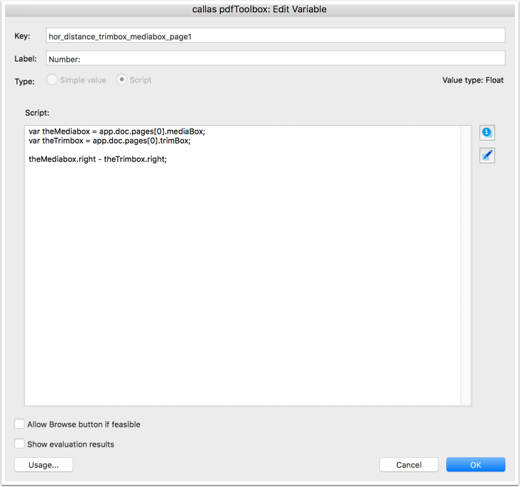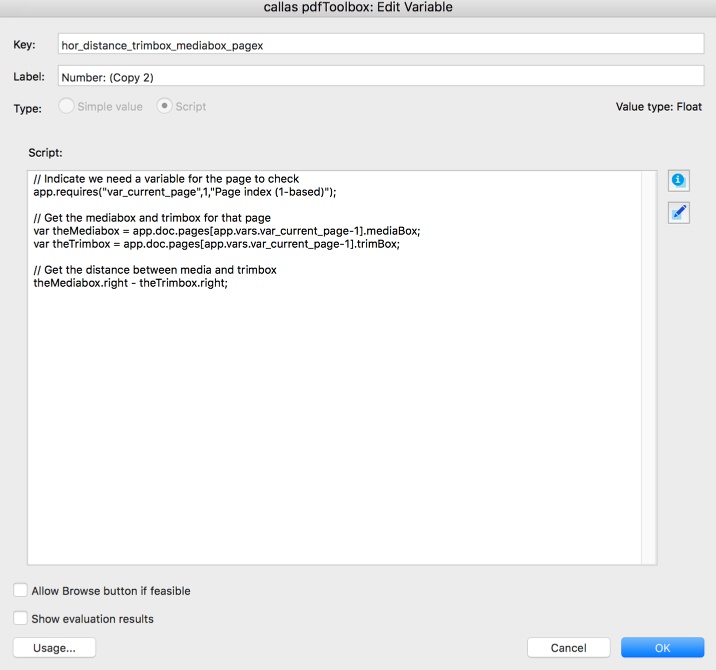 What we want to achieve here is to calculate the distance between the TrimBox and the MediaBox on the right side (hence the JavaScript variable) separately for each page. The solution can be achieved using a Process Plan which will run through all the pages and compare left and right (also top and bottom) for each page individually (Left of page 1 with left of page 2 and so on).